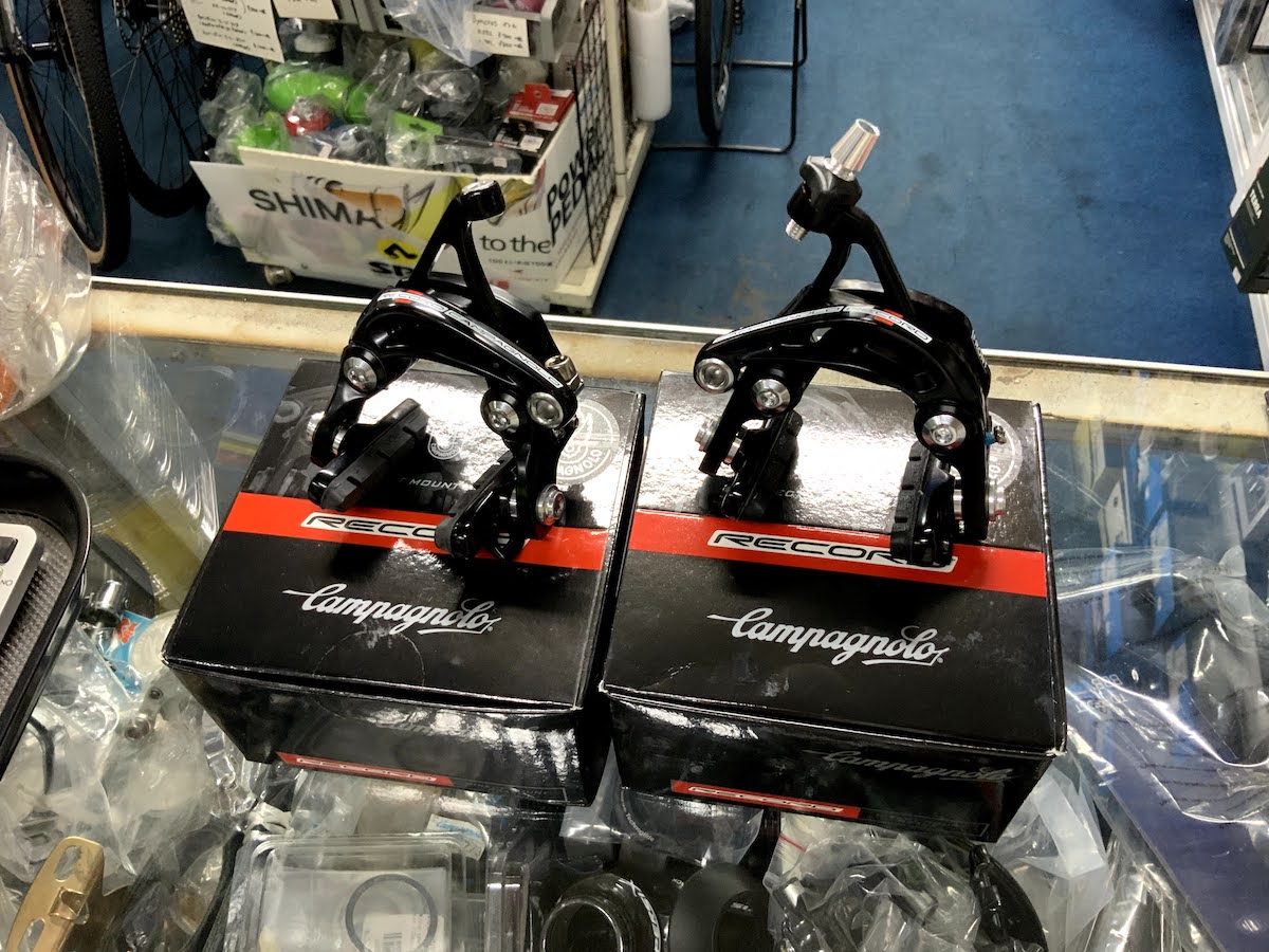 お客様にご注文頂いたカンパニョーロのダイレクトマウントブレーキが入荷しました! レコードグレードのモデルになります!(ノングレードとの2モデルから選べます) リアはBB下用のモデルになっています。